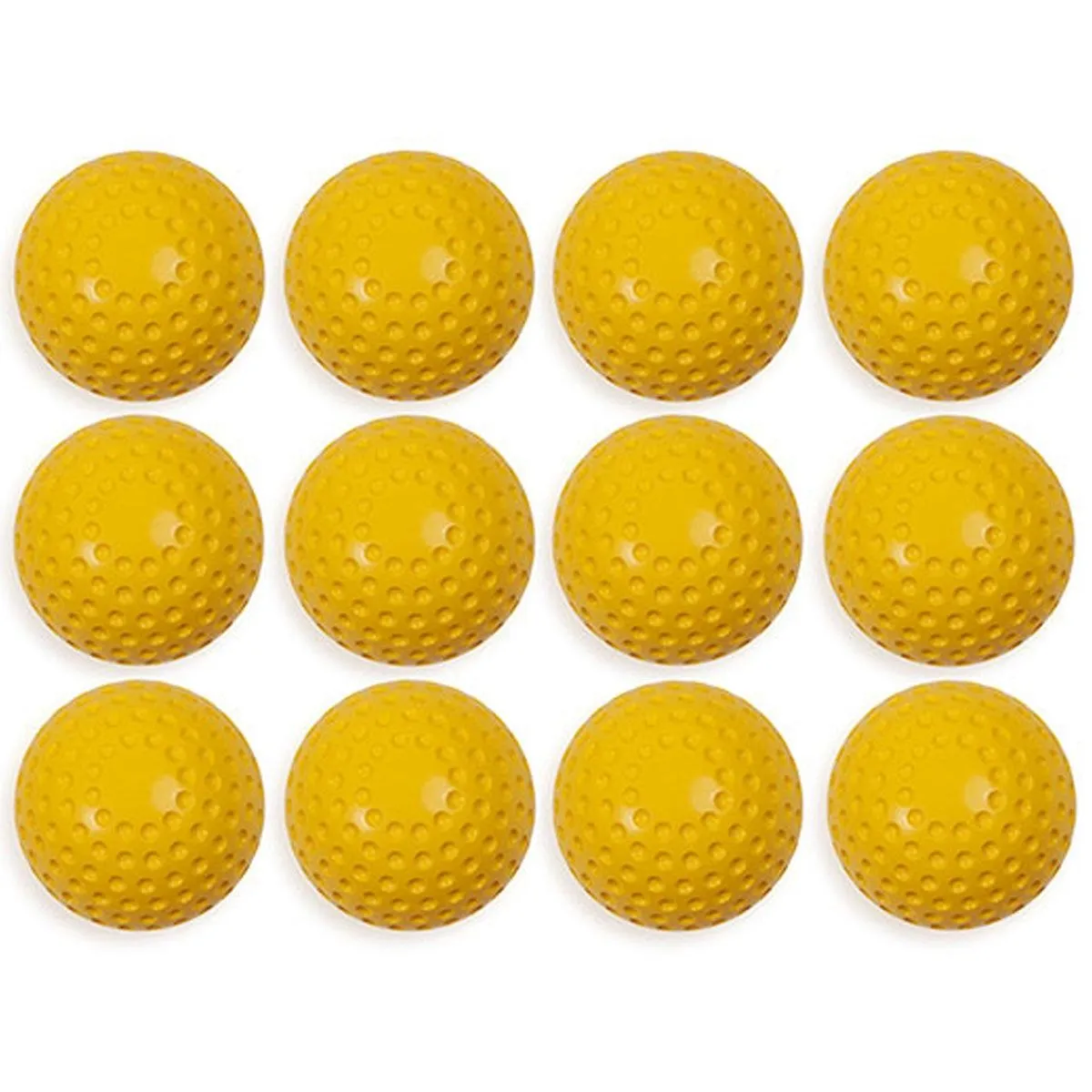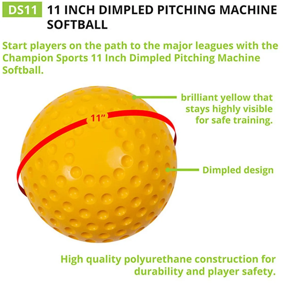 Dimpled pitching machine softballs are made of a plastic and vinyl composite for exceptional durability. The dimpled design is perfect for use with any standard pitching machine and the bright yellow color offers high visibility!