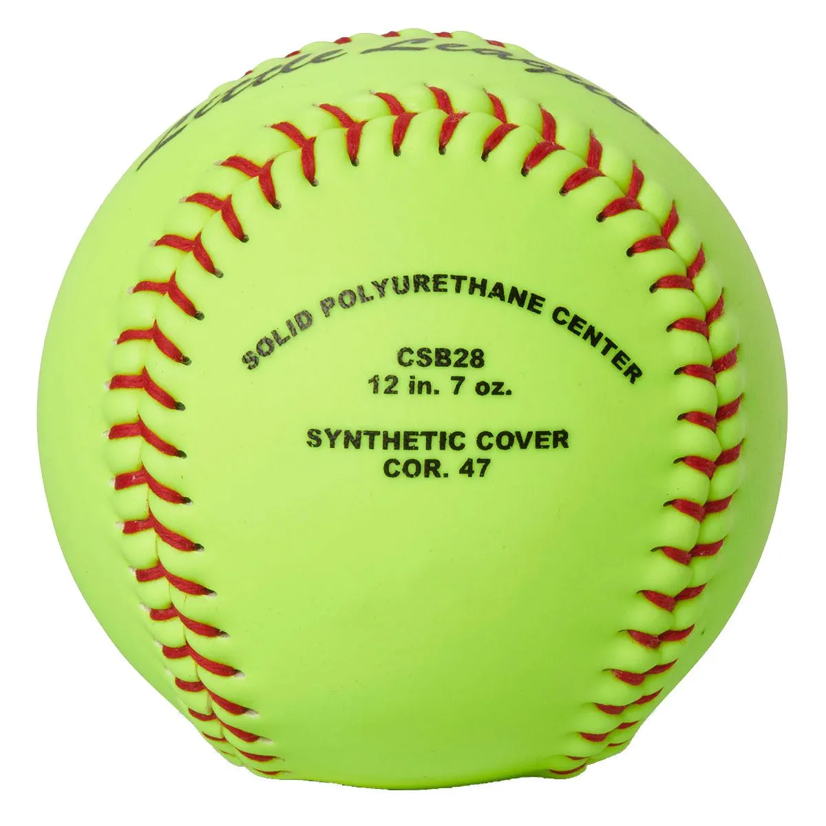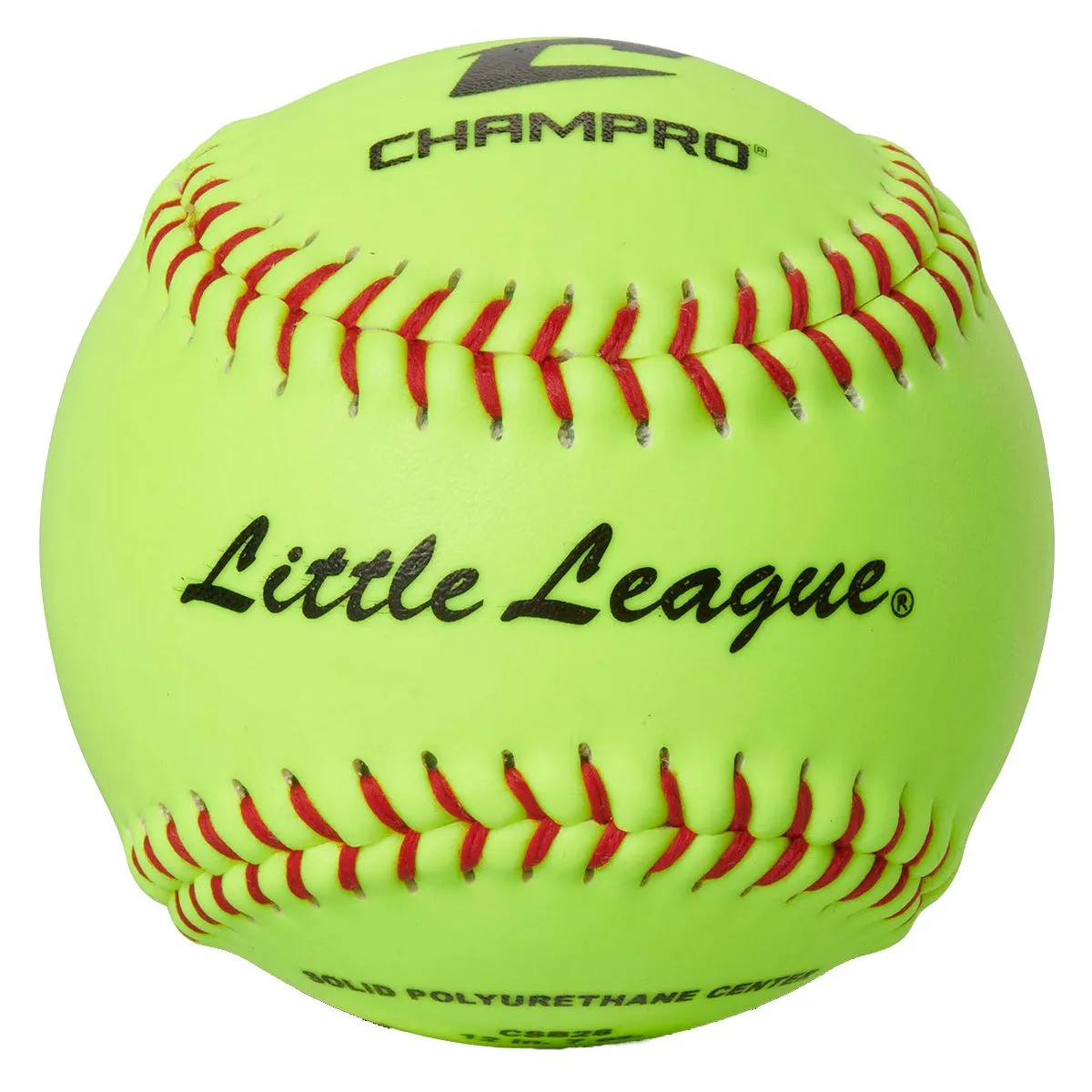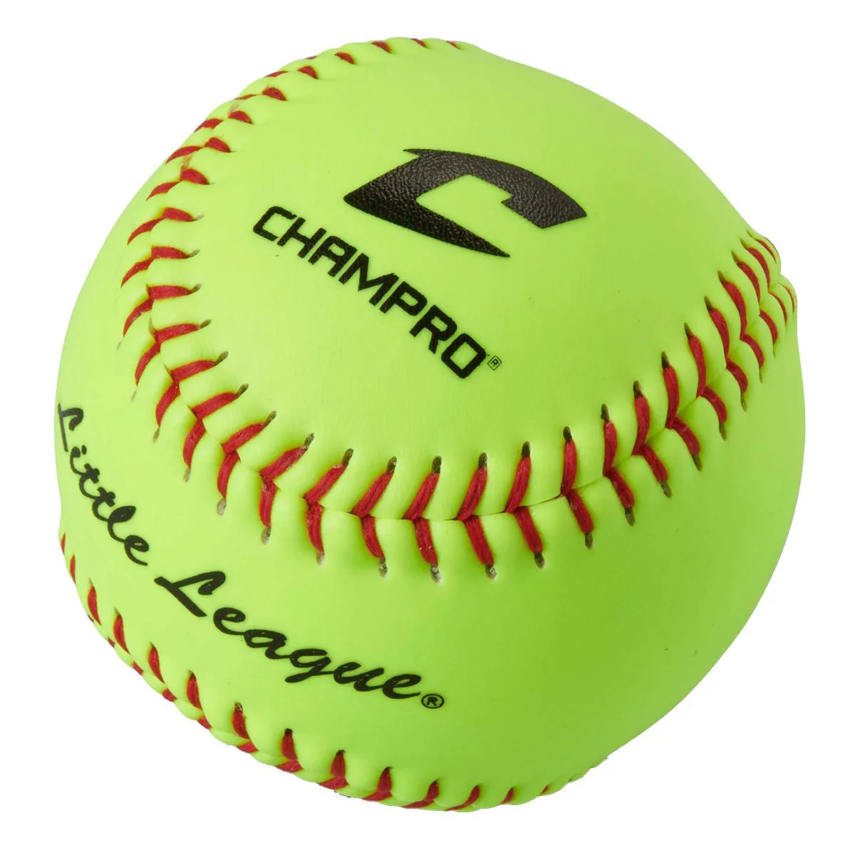 The Champro 12” fastpitch softballs are Little League® approved and feature an optic yellow durahide cover with red stitching. These softballs are constructed with a solid polyurethane core, raised seams, .47 COR, and 375 compression.