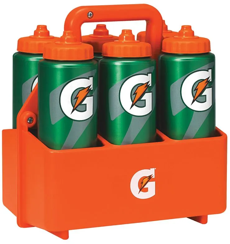 This sturdy plastic carrier has a convenient molded handle and holds six 32 ounce Gatorade squeeze bottles (sold separately)