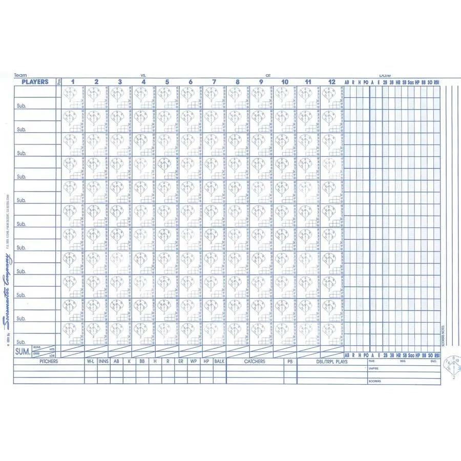 So easy, anyone can keep score! The pScoremaster Scorebookp keeps a spimplified, complete record of the game and the players. This scorebook keeps score of 12 innings and there is room for 11 players and 11 substitutions. The Scoremaster has a tough plastic; maroon front cover and a thick back cover for easy writing.